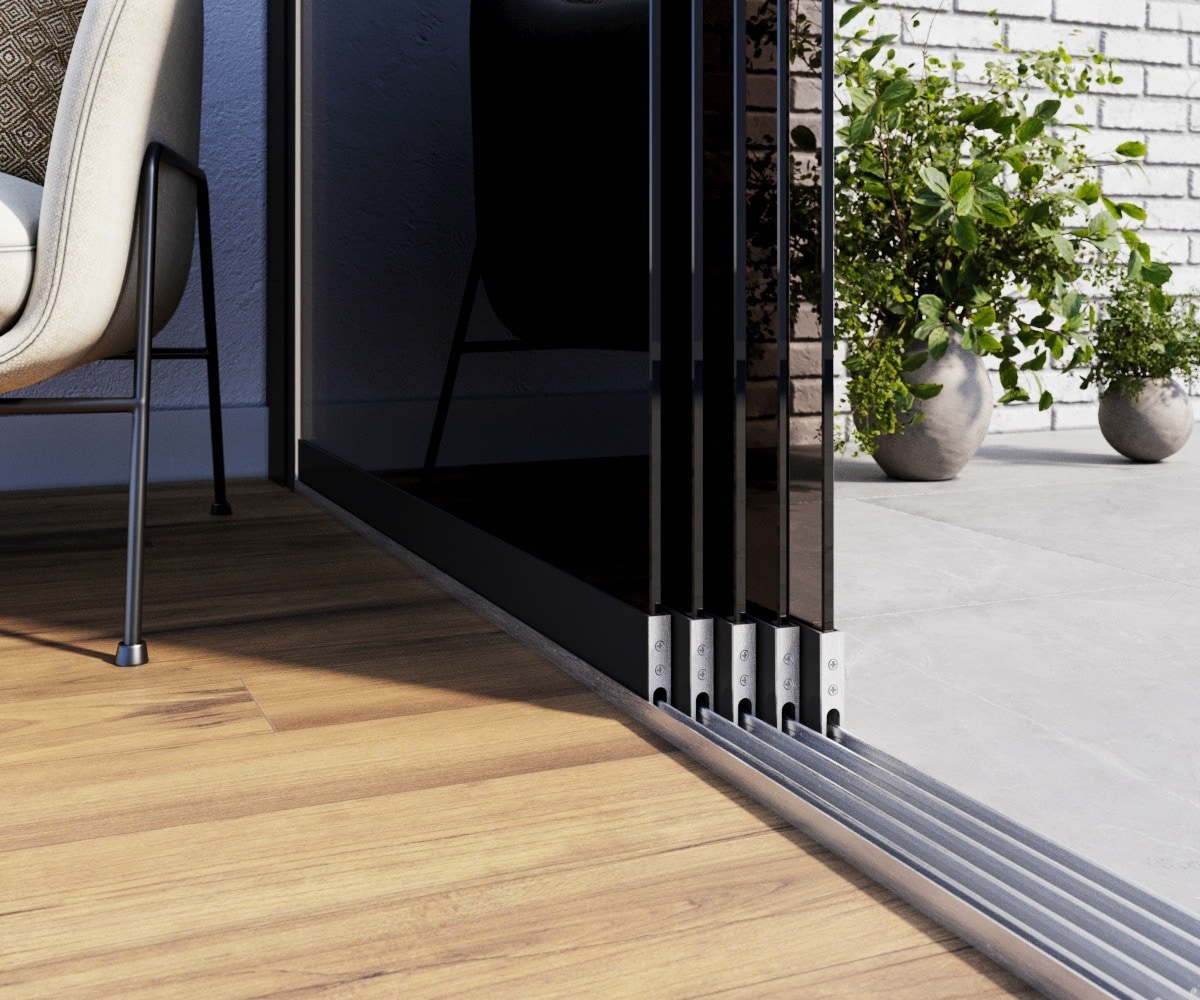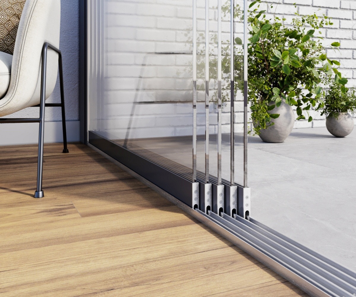 Elke glazen schuifwand is uitgerust met glazen panelen die onafhankelijk over hun eigen rails bewegen.